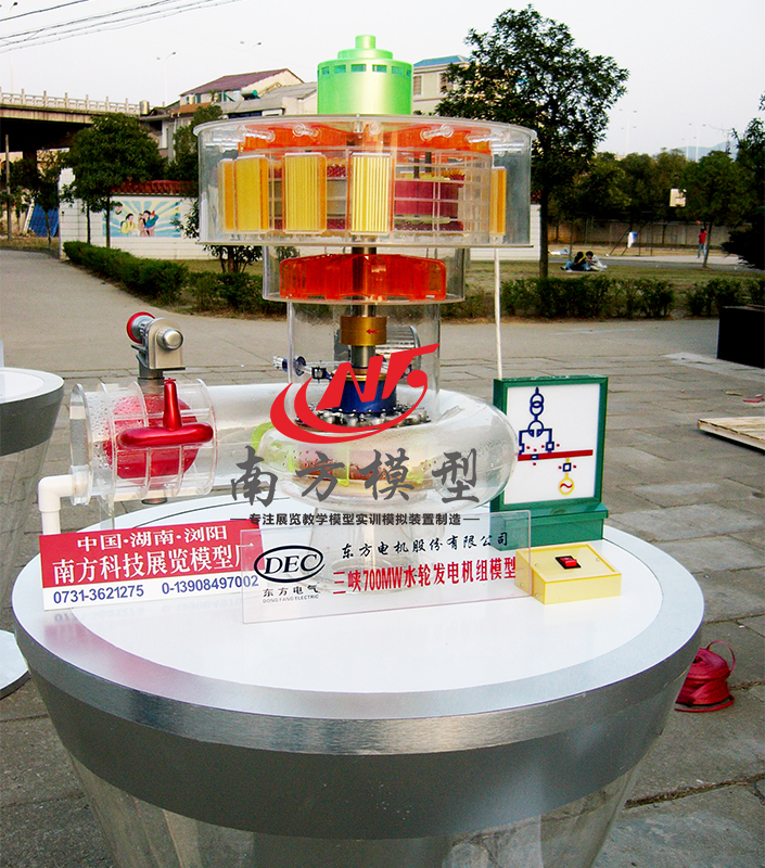 水力發(fā)電模型 水力發(fā)電的基本過程:在河川的上游筑壩集中河水流量和分散的河段落差,使水庫中的水具有較 高的勢能,當(dāng)水由壓力水管流過安裝在水電站廠房內(nèi)的水輪機(jī)排至下游時(shí),帶動水輪機(jī)旋轉(zhuǎn),水 能轉(zhuǎn)換成水輪機(jī)旋轉(zhuǎn)的機(jī)械能;水輪機(jī)轉(zhuǎn)軸帶動發(fā)電機(jī)5的轉(zhuǎn)子旋轉(zhuǎn),將機(jī)械能轉(zhuǎn)換成電能。
