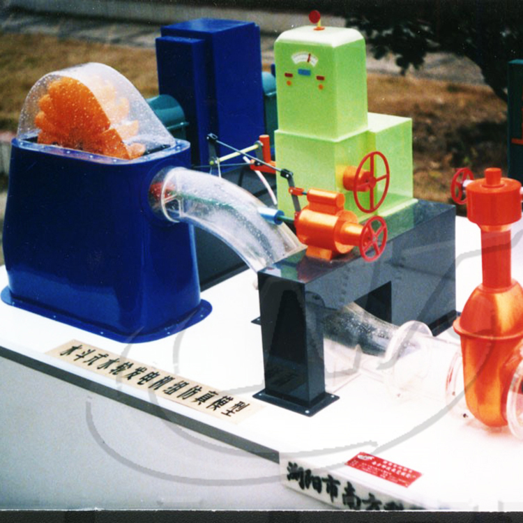 功能概述:泵站樞紐工程仿真模型由泵站進(jìn)水與出水流道、微縮仿真電機(jī)外殼、葉輪、金屬泵軸等組成。摁下開(kāi)關(guān),會(huì)看到水泵葉輪勻速模擬轉(zhuǎn)動(dòng),LED燈光演示進(jìn)出水流道方向。