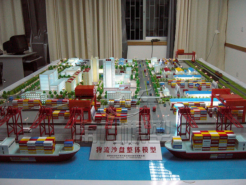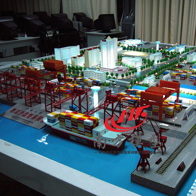 總體說明:沙盤根據(jù)港口的實(shí)際地面布局通過沙盤形式體現(xiàn)出來。沙盤中將港口、船舶、港區(qū)、堆場、銀行、機(jī)場等比例縮小做成立體模型,其中港口上的有關(guān)設(shè)備:龍門吊、岸邊集裝箱起重機(jī)、門坐式起重機(jī)等能夠模擬仿真運(yùn)行,燈光可以分區(qū)域分別控制,各個(gè)建筑物標(biāo)識清楚。模型制作精致,美觀大方。