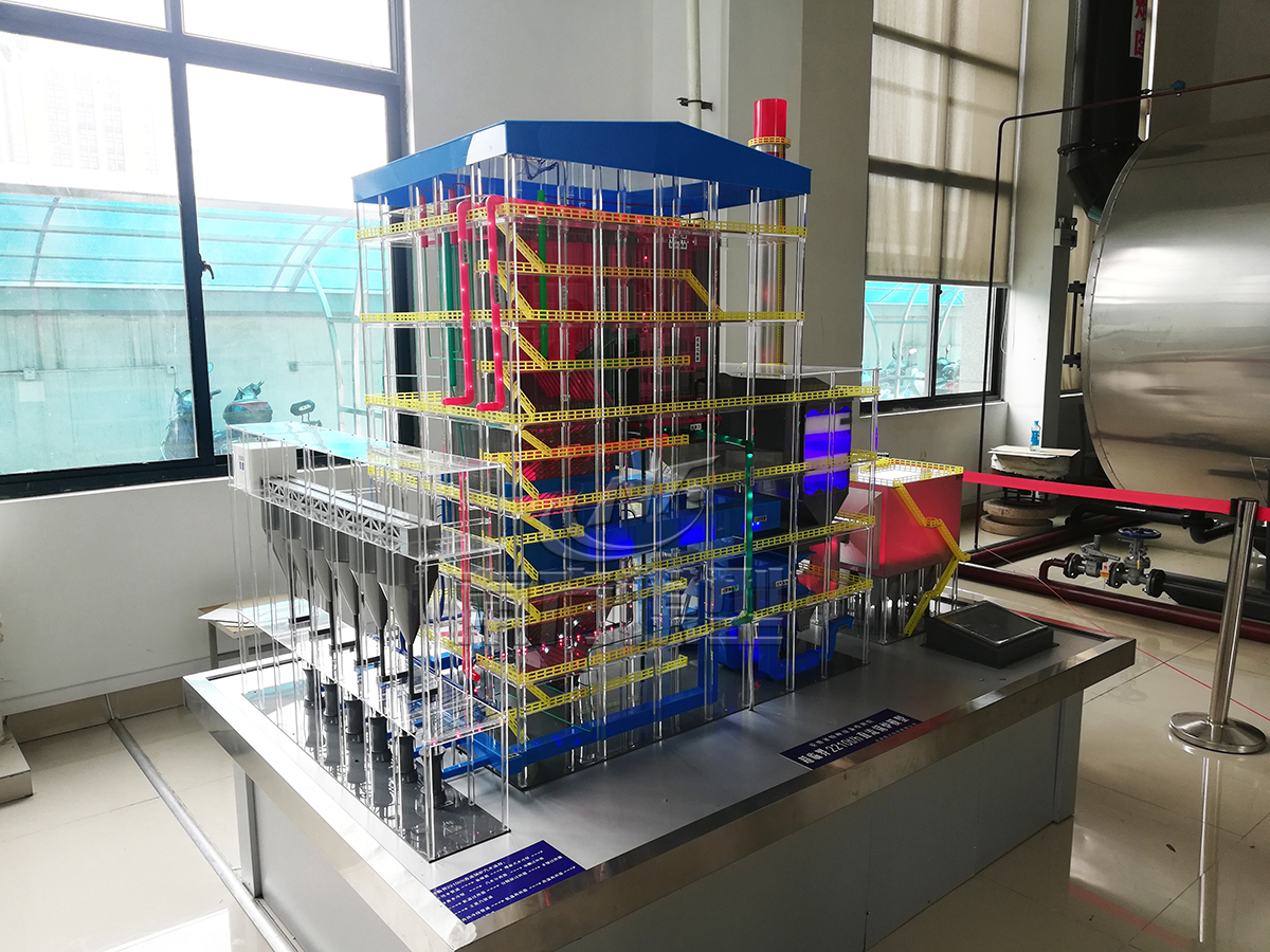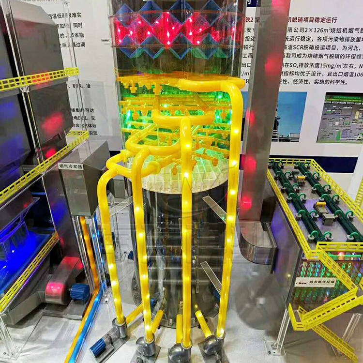 火力發(fā)電廠鍋爐模型 二、鍋爐尾部煙氣凈化處理系統(tǒng) 鍋爐尾部煙氣凈化處理系統(tǒng)包括:煙氣管道、脫硝系統(tǒng)(SCR)、高壓靜電除塵器、脫硫系統(tǒng)(FGD)、引風(fēng)機、煙囪。 1、脫硝系統(tǒng)模型:(SCR)(比例約為1∶30) (1)脫硝系統(tǒng)采用“選擇性催化還原法” 除去煙氣中的氮氧化合物(NOx)。工作過程:在鍋爐省煤器出口,含有NOx的煙氣,與氨氣均勻混合,經(jīng)反應(yīng)塔(每臺鍋爐左右兩個)內(nèi)的催化劑后,NOx轉(zhuǎn)化為氮氣和水蒸氣。 主要內(nèi)容包括:反應(yīng)塔(2)座及其噴氨設(shè)備、催化劑(3)層。光電設(shè)計噴氨時燈光顯示,流進反應(yīng)塔的煙氣顏色與流出反應(yīng)塔的煙氣顏色發(fā)生變化,通過燈光顏色的改變來直觀模擬煙氣脫硝的過程。