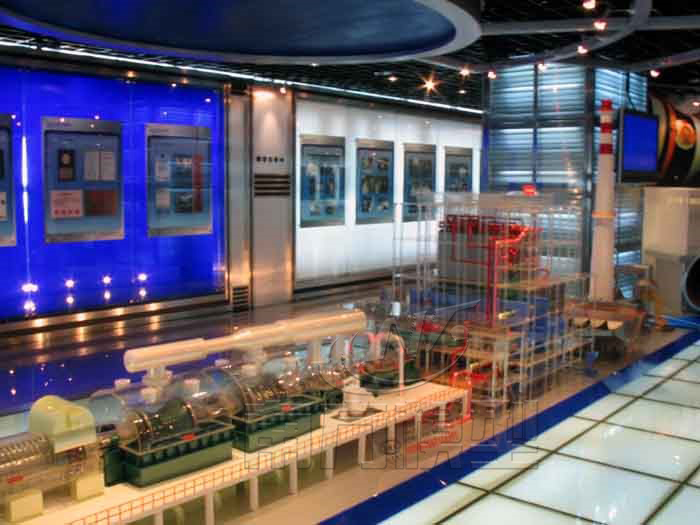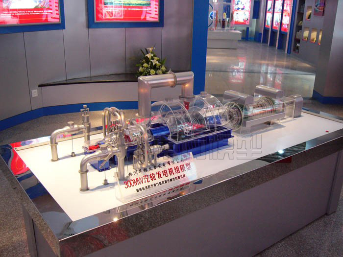火力發(fā)電廠汽輪機模型 汽輪機本體包括:高中壓合缸、低壓缸、隔板、隔板套、轉(zhuǎn)子、葉片、高壓噴咀、大汽管、高壓主汽閥(2個)、中壓主汽閥(2個)、盤車、機頭箱內(nèi)包括:主油泵、危急保安器、調(diào)速滑閥均做出外形。汽輪機隔板及轉(zhuǎn)子葉片均按圖紙將凹扭形狀加工做出;并將汽輪機、縱銷、橫銷、立銷、角銷、死點、貓爪做出。以上設(shè)備部件分別用不同顏色的有機玻璃及部分金屬材料制作。 汽輪機本體主要模擬轉(zhuǎn)子經(jīng)模擬氣流沖擊后轉(zhuǎn)動的工作過程,能看到缸內(nèi)高壓噴嘴、缸內(nèi)隔板、隔板套、轉(zhuǎn)子上葉片。 輔助設(shè)備包括:凝結(jié)水泵、給水泵、低壓加熱器、高壓加熱器、除氧器及水箱、主蒸汽管、再熱蒸汽管、主給水管、主凝結(jié)水管等,設(shè)備均用不同顏色的有機玻璃壓制成形。本部分輔助設(shè)備(機械)主要用燈光模擬汽、水的流動形式及設(shè)備的工作過程。 循環(huán)水系統(tǒng)包括凝汽器、循環(huán)水泵、冷卻水塔、循環(huán)水進出水管,凝汽器能顯示循環(huán)水進水室、出水室、管束布置結(jié)構(gòu)等