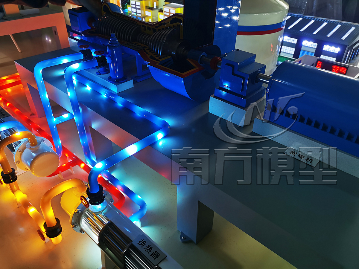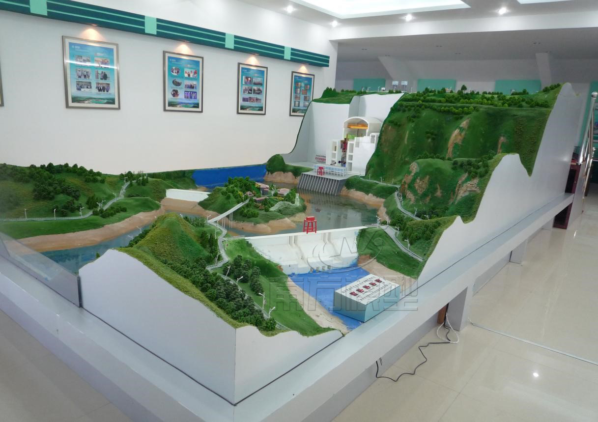 抽水蓄能電站整體布局仿真模擬實(shí)訓(xùn)設(shè)備按比例反映出庫(kù)區(qū)的地形地貌和各種建筑物以及各類設(shè)備實(shí)物,抽水蓄能電站機(jī)組模型采用一臺(tái)1/4剖面、機(jī)組蝸殼使用透明有機(jī)玻璃,進(jìn)行立體全包圍,能看到內(nèi)部的水輪機(jī)的形狀;模型清楚地表達(dá)了廠房的總體結(jié)構(gòu)和水電廠的各部分組成。